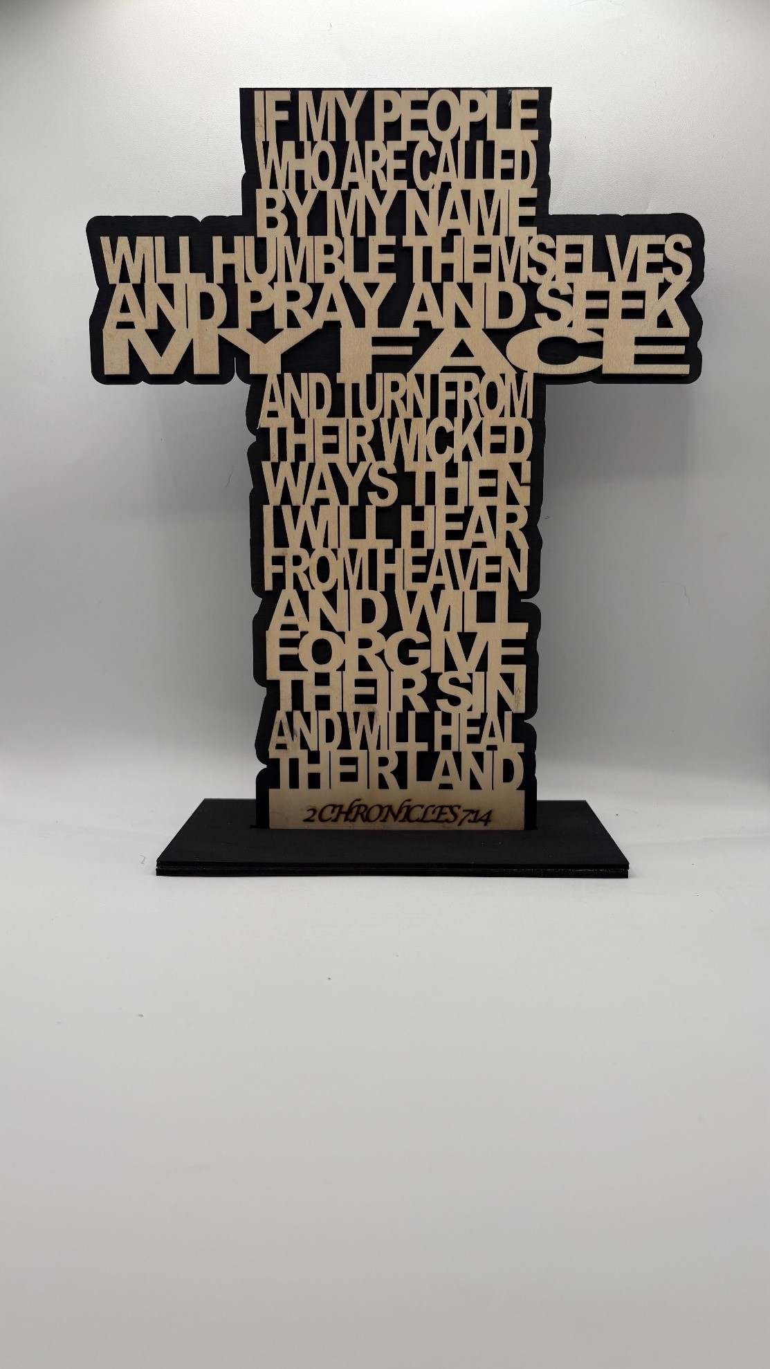Laser cut cross, 2 chronicles 7:14, approximately 11 x 5, gold letters, black backing and stand. Show in whom you believe on your desk or bookshelf. Free shipping.